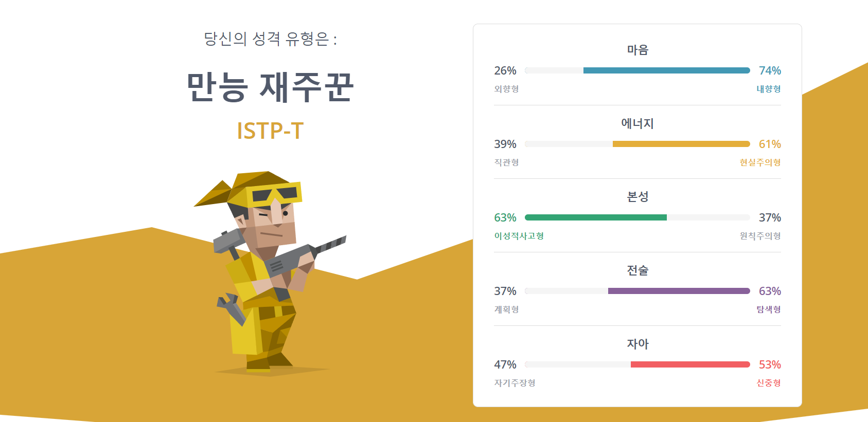 따라서 신년을 핑계로 오랜만에 mbti를 해본다. 물론 이를 진지하게 받아들일 생각은 없다. 그저 심심풀이 정도일 뿐.